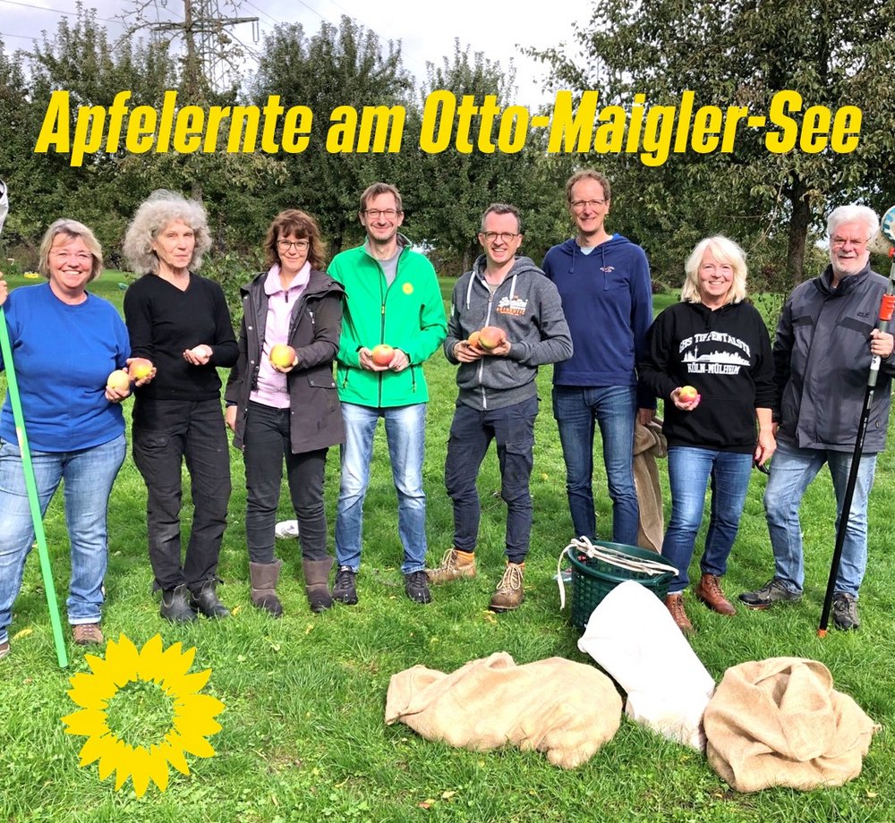 Gemeinsame Apfelernte der Grünen Hürth auf der Streuobstwiese am Otto-Maigler-See. Grünes Ratsmitglied Manuel Busch hat seit diesem Sommer die Pflege der Obstbäume übernommen. Jetzt haben die Grünen Mitglieder die letzten Äpfel geerntet und bei der Biostation Rhein-Erft-Kreis / Bonn an der Gymnicher Mühle zu Saft verarbeiten lassen. Stolze 130 Liter sind dabei zusammengekommen.