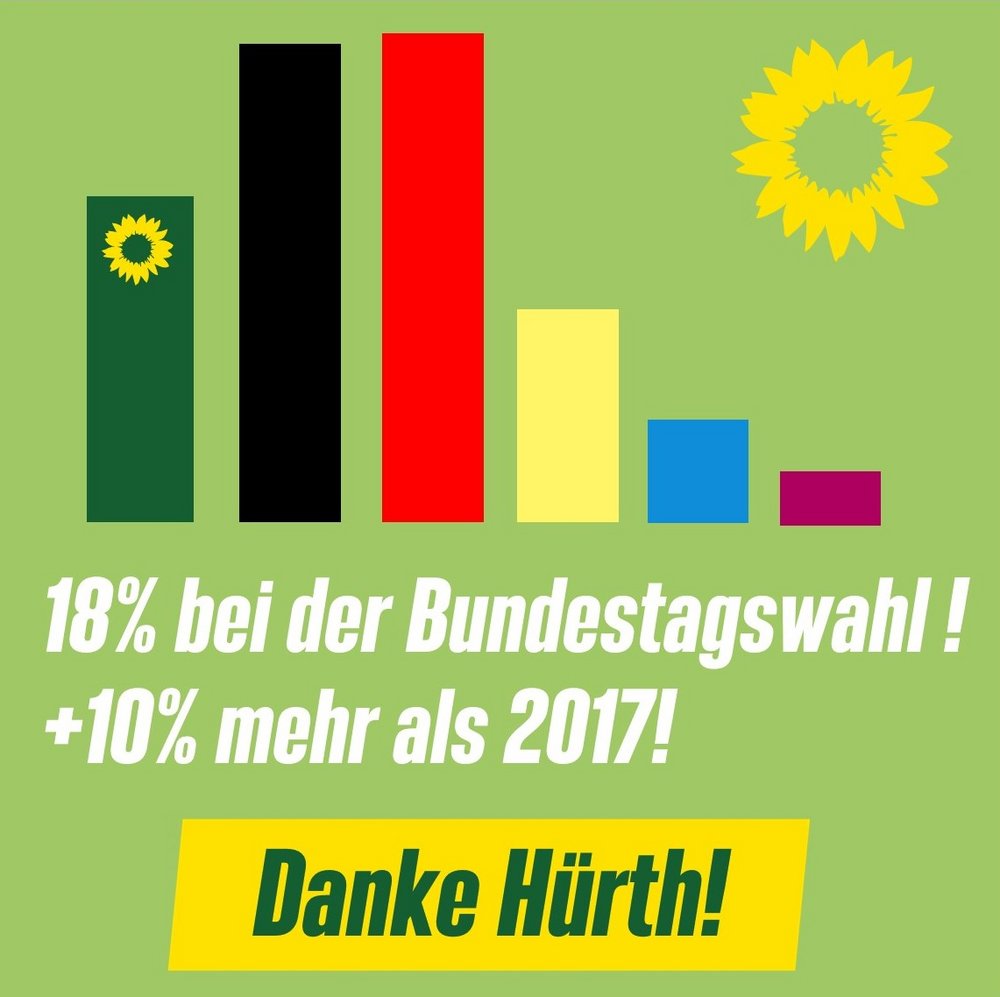 Wir freuen uns sehr über 18,3% der Wählerstimmen in Hürth. Vielen Dank an alle Wähler*innen! Das ist ein tolles Ergebnis, das uns auch in Hürth in unserer Arbeit stärkt für Klimaschutz, ein soziales Miteinander, gute Bildung und eine zukunftsfähige Wirtschaft.
