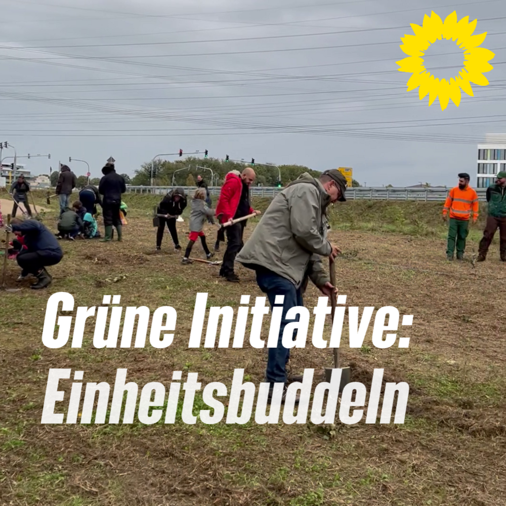 So kommt das „Einheitsbuddeln“ am 3. Oktober zur rechten Zeit. Im letzten Jahr musste die von den GRÜNEN beantragte Aktion aufgrund von Corona abgesagt werden. Nun war es so weit: Spaten einpacken und los! Wer keinen hatte konnte ohne anreisen, denn die Stadt stellte auf einem Streifen zwischen Max-Planck-Straße und Jägerpfad einige Pflanzgeräte zur Verfügung. Ob es die Spaten der Gartenkolonne waren, ober diejenigen, die beim ersten Spatenstich für Baumaßnahmen zum Einsatz kommen, spielte keine Rolle.