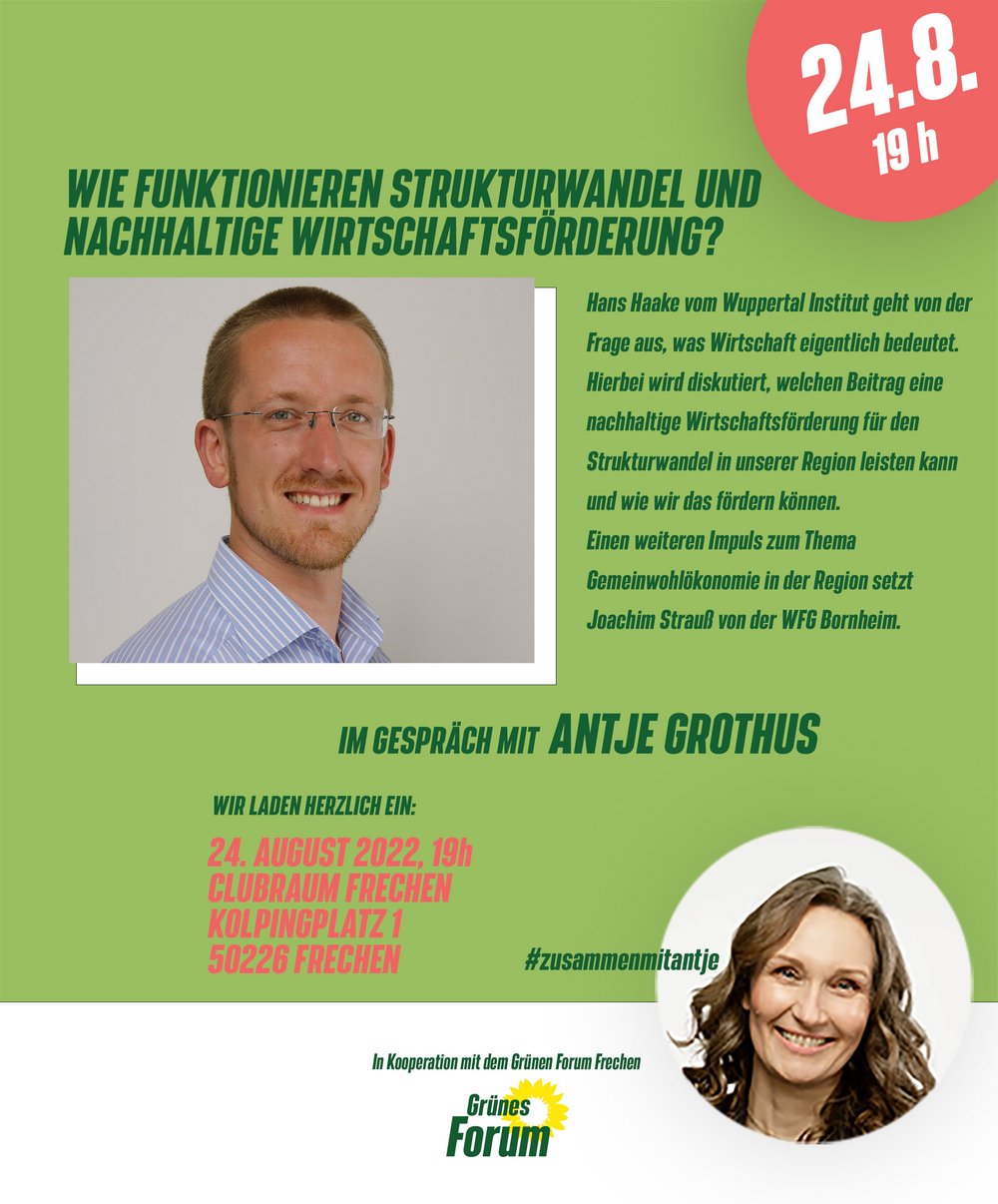 Das Grüne Forum lädt zum Gespräch ein mit Hans Hake vom Wuppertal Institut mit unserer Landtagsabgeordneten Antje Grothus zu Wirtschaft und Strukturwandel. Die Veranstaltung findet am 24. August um 19 Uhr im Clubhaus Frechen (Kolpingstr. 1, 50226 Frechen) statt. Wir freuen uns auf euer Kommen!