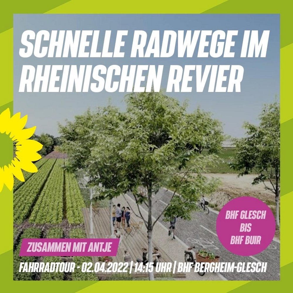 BÜNDNIS 90/DIE GRÜNEN im Rhein-Erft-Kreis laden am Samstag, den 2.4.2022 zu einer Fahrradtour entlang des Tagebaues Hambach ein. Startpunkt ist um 14:15 Uhr am Bahnhof Glesch. Die ca. 25 km lange Route führt über den Speedway, Terra Nova, Manheim und weiter durch den Hambacher Wald bis zum Bahnhof Buir: größtenteils entlang der Routen, die aktuell im Gesamtregionalen Radverkehrskonzept Rheinisches Revier vorgesehen sind. Die Tour wird u.a. begleitet von Johannes Bortlisz-Dickhoff und den grünen Landtagskandidat*innen Antje Grothus und Ahmet Özdemir.