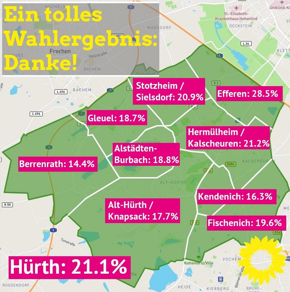 Eine klare Entscheidung für mehr Klimaschutz und eine Mobilitäts- und Energiewende für Hürth. Mit 21,1% haben die GRÜNEN Hürth deutlich zu der letzten Kommunalwahl 2014 dazugewinnen können und liegen leicht über dem Ergebnis, das NRW-weit von den GRÜNEN erzielt werden konnte. Damit ziehen die Grünen als drittstärkste Kraft mit 10 Sitzen von insgesamt 48 in den Rat der Stadt Hürth ein. „Wir freuen uns riesig über den großen Zuspruch, den unser Wahlprogramm und unserer Kandidatinnen und Kandidaten bei den Hürther Wählerinnen und Wählern erreicht haben und möchten uns bei allen für ihr Vertrauen bedanken.“, freut sich Britta Bojung, Vorsitzende der Grünen Hürth.