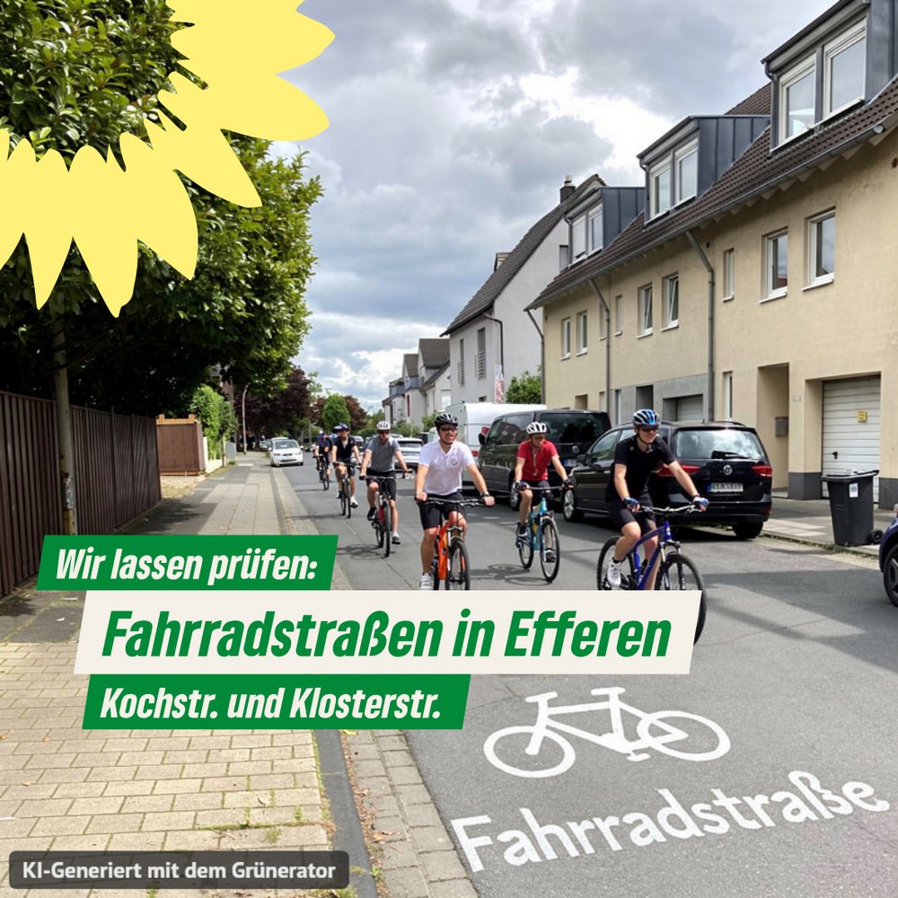 Zur Sitzung des Planungsausschuss haben die Grünen zusammen mit der CDU den Antrag eingereicht zu prüfen, ob die Kochstraße und die Klosterstraße in Efferen in Fahrradstraßen umgewandelt werden können. „Diese verbinden Hermülheim mit Köln und sind eine wichtige Route zu den Efferener Sportplätzen“, meint Thorsten Steckstor, Grünes Ratsmitglied aus Efferen. „Die Route bietet sich an, da sie parallel zur Bachstraße führt, wo Radverkehr kaum Platz neben dem vorherrschenden Autoverkehr hat“, so Thorsten Steckstor weiter. Die Grünen Hürth hatten in den letzten Jahren bereits an mehreren Stellen in Hürth erfolgreich das Ausweisen von Fahrradstraßen prüfen lassen. So sind inzwischen Teile der Bonnstraße, Kölnstraße und Bahnstraße als Fahrradstraßen ausgewiesen. Erst kürzlich ist die Straße Zum Komarhof dazugekommen. Mit dem Umbau der Kreuzung Sudetenstraße / Horbeller Straße soll zukünftig auch die Lortzingstraße als wichtige Verbindung zu dem Schulzentrum Fahrradstraße werden. „Gerade in Zeiten teurer Spritpreise zeigen wir, dass schnelle Radrouten durch Hürth eine echte Alternative zum Auto sein können. Das werden wir auch weiter vorantreiben“, erklärt Hendrik Fuchs, Fraktionssprecher der Grünen.