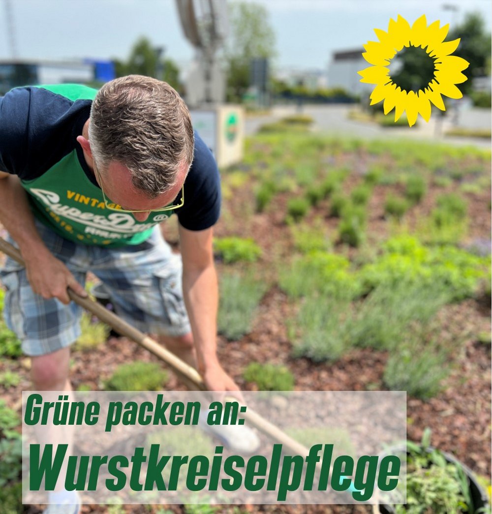 Nachdem der Wurstkreisel auf unsere Initiative entschottert und bepflanzt wurde, ging es heute an die Unterstützung bei der Pflege. Manuel Busch, Mitglied der Grünen im Stadtrat, und Hendrik Fuchs, Fraktionssprecher der Grünen im Stadtrat, entfernten da Unkraut, das sich auch auf dem neuen neu gestalteten Kreisel wohlfühlt, aber den Kräutern Raum wegnimmt. Jetzt können die neu gepflanzten Kräuter sich weiter ausbreiten und blühen! Wir freuen uns immer noch sehr, dass der Kreisel ergrünt ist und die Pflanzen auch dank des regelmäßigen Wässerns durch die Firma FloriaM Gartenbau gut gedeihen.