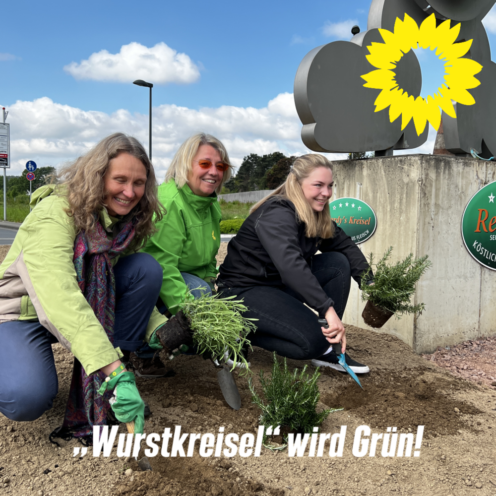 Am Samstag, den 30.4. wurde aus dem etwas staubigen Kreisverkehr im Gewerbegebiet ein abwechslungsreicher mediterraner Kräutergarten rund um die Edelstahlwurst. Der berühmte Remagensche „Wurstkreisel“ in Kalscheuren, von der Firma Hardy Remagen GmbH vor 8 Jahren eingeweiht und mit einer Edelstahlskulptur in Form der allseits beliebten Grillwurst gekrönt, erstrahlt in neuem Glanz. Die GRÜNEN Hürth hatten die Idee, aus den bestehenden Schotterflächen eine ansprechende Blühfläche zu kreieren. Ivo Bathke vom B.U.N.D. entwickelte einen passenden Pflanzplan, Nicole Remagen vertrat die Hardy Remagen GmbH als Stifterin, Alexander Roozen beteiligte sich als Pflanzenlieferant und zu guter Letzt hat sich die Firma FloriaM Gartenbau dankenswerterweise bereit erklärt, die dauerhafte Pflege zu übernehmen.