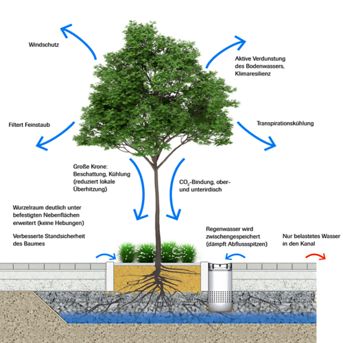 Hierbei soll der Überschuss an Regenwasser aus den Fußgängerbereichen in niedriger gelegte Pflanzbeete geleitet werden. Von dort aus gelangt das Wasser in miteinander verbundene Wurzelbereiche der Stadtbäume. Eine große Zisterne als letztes Auffangbecken wiederum dient bei ausbleibendem Regen der Bewässerung der Grünflächen. Auch oberirdische Wasserbecken sind eingeplant.